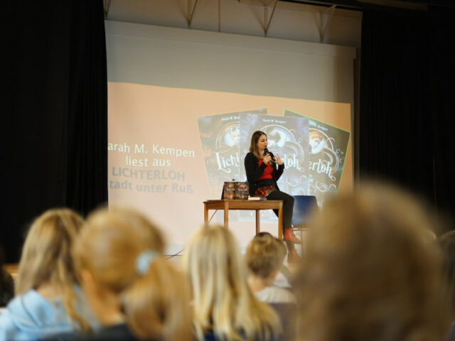 Zu Beginn der Lesung erzählte Sarah M. Kempen etwas über ihre Buchreihe „Lichterloh“, deren erster Band bereits ausgezeichnet wurde. In der Reihe geht es um ein Mädchen, das unbedingt Schornsteinfegerin werden möchte – einen Beruf, in den man in ihrer Welt hineingeboren werden muss, weil er als besonders angesehen gilt. Denn in dieser Welt wird alles mit Kohle betrieben, und überall liegt Ruß in der Luft. Anschließend las die Autorin Ausschnitte aus dem ersten und zweiten Band vor und zeigte dazu passende Bilder aus den Büchern. Zum Abschluss konnten die Zuhörerinnen und Zuhörer Fragen stellen. In der Fragerunde berichtete Sarah M. Kempen Interessantes über ihren Beruf und das Schreiben.
