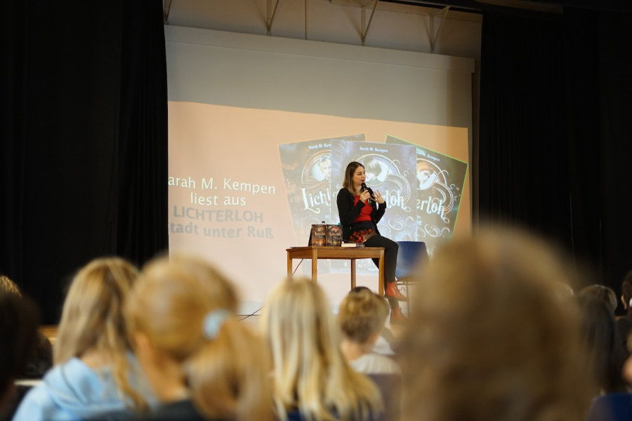 Zu Beginn der Lesung erzählte Sarah M. Kempen etwas über ihre Buchreihe „Lichterloh“, deren erster Band bereits ausgezeichnet wurde. In der Reihe geht es um ein Mädchen, das unbedingt Schornsteinfegerin werden möchte – einen Beruf, in den man in ihrer Welt hineingeboren werden muss, weil er als besonders angesehen gilt. Denn in dieser Welt wird alles mit Kohle betrieben, und überall liegt Ruß in der Luft. Anschließend las die Autorin Ausschnitte aus dem ersten und zweiten Band vor und zeigte dazu passende Bilder aus den Büchern. Zum Abschluss konnten die Zuhörerinnen und Zuhörer Fragen stellen. In der Fragerunde berichtete Sarah M. Kempen Interessantes über ihren Beruf und das Schreiben.