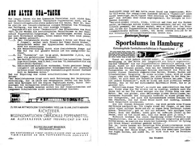 In einem Rückblick kann auch einmal ein Rückblick stecken. So schreibt der Redaktionsleiter Uwe Naumann (12. Klassenstufe) in der Schülerzeitung „Der Schwamm“ in Nr. 34 vom März 1969 rückblickend über die „Zustände“ am GOA Anfang der 1950er-Jahre. Bevor Sie weiterlesen: Hier geht es um nicht-hygienische Aborte, gemeinsames Umziehen von Jungen und Mädchen für den Sportunterricht als Zeichen von „Zwanglosigkeit und gutgemeinter Unbekümmertheit der Lehrkräfte“ sowie um eine angesichts dickschädlicher Schülerköpfe nachgebende Decke…