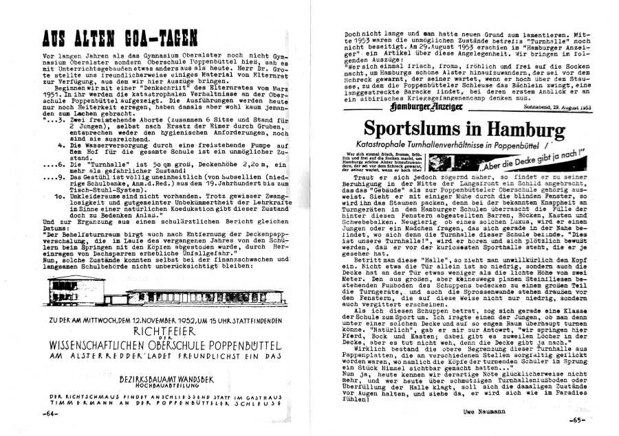 Und dann hörte mein Vater 1946 den Vortrag eines Herrn Dr. Eckmann, der in der Grundschule meiner Schwester für seine Oberschule in Poppenbüttel [dem heutigen GOA] warb. In seinem Vortrag sprach er auch davon, dass es nichts schade, wenn man mal ein Schuljahr wiederholen müsse; denn was bedeute es im Blick auf ein ganzes Leben, wenn man ein Ziel statt in 12 erst in 13 Jahren erreicht, wichtig sei doch nur, dass man es erreiche. Ich hatte die Versetzung in Volksdorf gerade noch geschafft, musste aber, weil es meine neue Jahrgangsstufe in Poppenbüttel noch nicht gab, das Schuljahr […] wiederholen. So besuchte ich ab dem Sommerhalbjahr 1947 die ,Oberschule für Jungen und Mädchen in Poppenbüttel'.