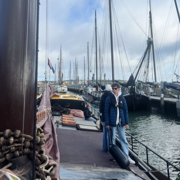Für unser Profil ging die Reise schon am Sonntagmorgen los. Um 8:30 versammelten wir uns am Hauptbahnhof und stiegen mit unserer Begleitung, Herrn Herber, in die erste Bahn Richtung Amsterdam. Als wir um ca. 14 Uhr in der Hauptstadt ankamen, durften wir einige Stunden die Stadt erkunden. Für uns bedeutete das Kaffee trinken, die Einkaufsstraßen erkunden und selbstverständlich virale Food Spots ausprobieren. Die Zeit verging wie im Flug, weshalb wir um 18 Uhr auch schon wieder vor dem Hauptbahnhof Amsterdams standen. Nach dem kurzen Zwischenstopp ging es zügig weiter, sodass wir gegen 21 Uhr in Harlingen standen und von einer Matrosin abgeholt wurden, um zu unserem Boot geführt zu werden. Direkt als wir ankamen, waren wir erstaunt, wie groß unser Schiff in Echt war. Zusätzlich erklärte uns Herr Herber, dass wir Glück mit dem Schiff hatten, da einige Boote nicht immer in bester Form sind.