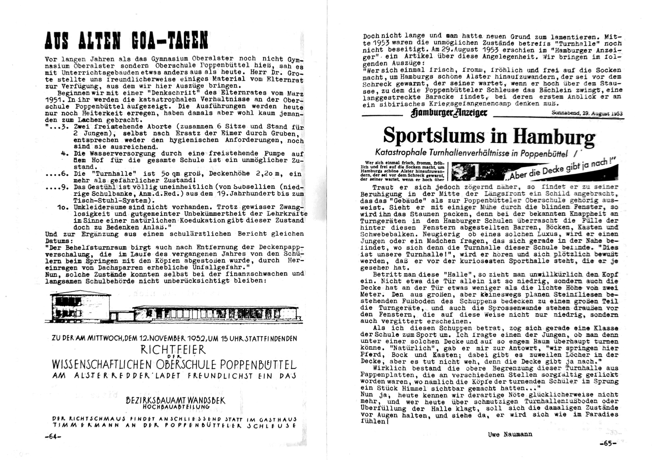 In einem Rückblick kann auch einmal ein Rückblick stecken. So schreibt der Redaktionsleiter Uwe Naumann (12. Klassenstufe) in der Schülerzeitung „Der Schwamm“ in Nr. 34 vom März 1969 rückblickend über die „Zustände“ am GOA Anfang der 1950er-Jahre. Bevor Sie weiterlesen: Hier geht es um nicht-hygienische Aborte, gemeinsames Umziehen von Jungen und Mädchen für den Sportunterricht als Zeichen von „Zwanglosigkeit und gutgemeinter Unbekümmertheit der Lehrkräfte“ sowie um eine angesichts dickschädlicher Schülerköpfe nachgebende Decke…