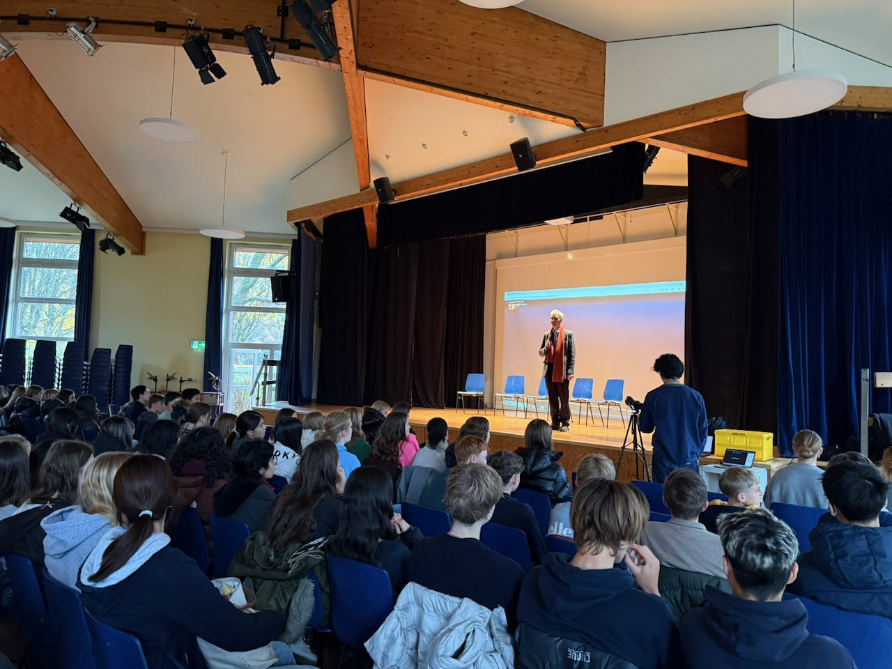 Während Jörg Stiehler als Jugendlicher mit seiner Mutter heimlich die Flucht über Ungarn wagte und alles zurückließ, stand Jan Pagels hinter den Idealen der DDR, leistete seinen Wehrdienst und plante ein Lehramtsstudium. Diese verschiedenen Perspektiven ließen die Schülerinnen und Schüler verstehen, wie unterschiedlich Menschen ein und dasselbe System erleben konnten. Besonders eindrucksvoll schilderten die Zeitzeugen, wie groß die Rolle der Mauer und die der politischen Kontrolle in ihrem Alltag war – von strengen Schulstrukturen über den Einfluss der Staatssicherheit bis hin zur Angst, wem man überhaupt vertrauen durfte.  Die Veranstaltung bot einen authentischen Blick auf ein Kapitel deutscher Geschichte, das für die heutige Schülergeneration bereits weit zurückliegt – und machte deutlich, wie wertvoll Demokratie und Freiheit sind. Sie zeigte uns, dass es in der Geschichte nie nur eine Perspektive gibt.