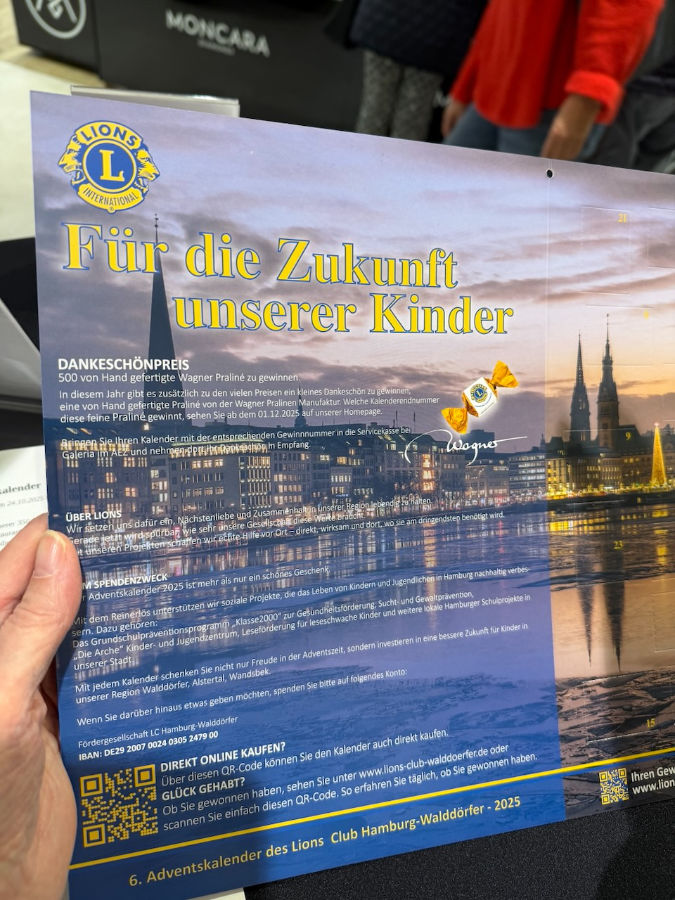 „Unser Lions Club Hamburg Walddörfer hat sich sehr darüber gefreut, in diesem Jahr eine besondere Unterstützung beim Adventskalenderprojekt durch das Gymnasium Oberalster zu erhalten. Schülerinnen und Schüler der Klassen 7b, 7c und 7e verkauften an fünf Nachmittagen im AEZ bei Galeria Adventskalender für den guten Zweck.
