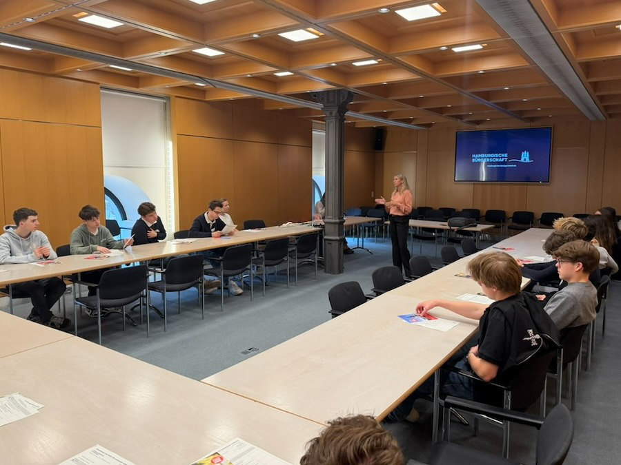 Eine Führung an diesem Tag war nicht selbstverständlich, da diese an Sitzungstagen der Bürgerschaft eigentlich nicht stattfinden. Dazu muss man wissen, dass die Hamburger Bürgerschaft jeden zweiten Mittwoch tagt. Dazu wiederum muss man wissen – falls das irgendjemandem wenig vorkommt – dass die Bürgerschaft ein so genanntes „Feierabendparlament“ ist. Die Abgeordneten gehen normalen Berufen nach und erledigen ihre politischen Aufgaben und Pflichten zusätzlich „nach Feierabend“. Dazu gehören unter anderem Ausschusssitzungen. In einem solchen Ausschusssaal wurden wir von Anja Quast, einer Abgeordneten des Wahlkreises Alstertal/Walddörfer, in dem unsere Schule liegt, empfangen.