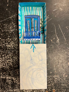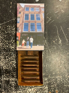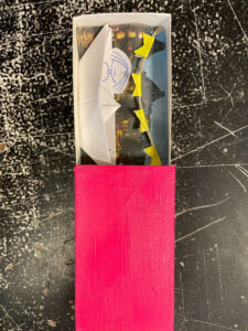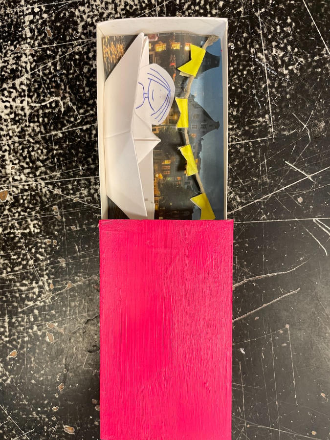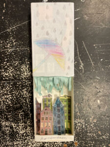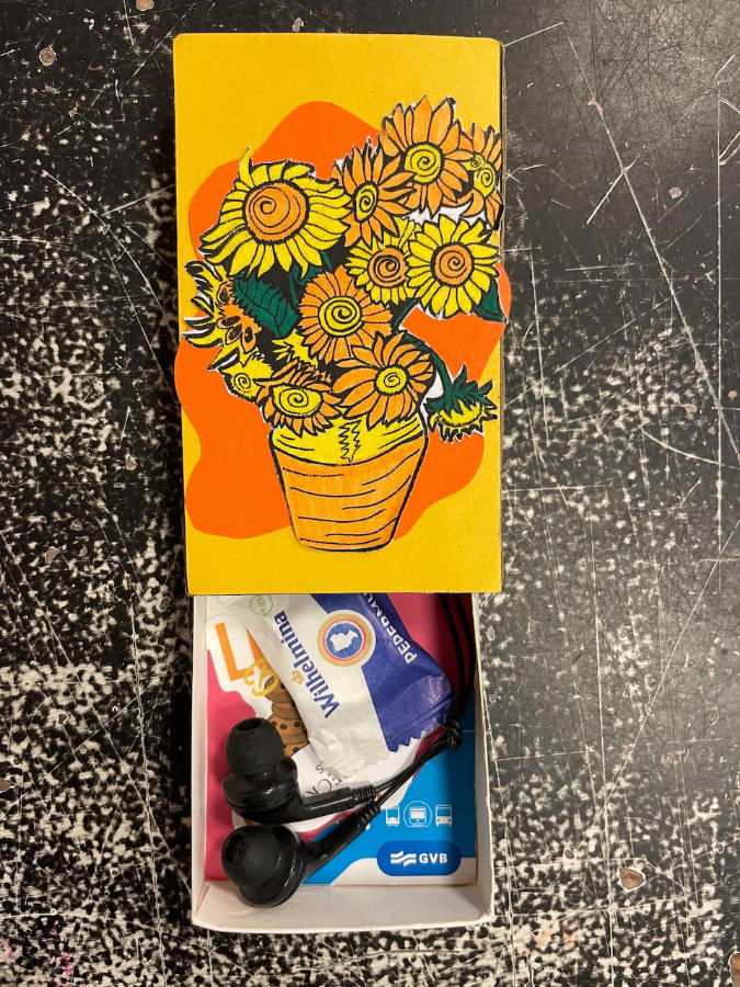 In meiner Streichholzschachtel habe ich viele Erinnerungen an Amsterdam gesammelt. Auf dem Deckel habe ich die blühenden Sonnenblumen gezeichnet, die an das Van-Gogh-Museum erinnern. Innen liegen die Bahnkarten als Symbol für unsere Wege durch die Stadt, ein Pfefferminzbonbon für den süßen Laden, in dem ich mit Freunden essen war, und ein kleines Victoria’s Secret Kärtchen, das uns allen eine Freude bereitet hat. Das pinke Papier steht für das Shoppen, das bronzefarbene geprägte Erinnerungsstück für ein besonderes Souvenir & die Kopfhörer erinnern an unsere Grachtenfahrt. So wird die Schachtel zu einem kleinen Museum der besonderen Momente.