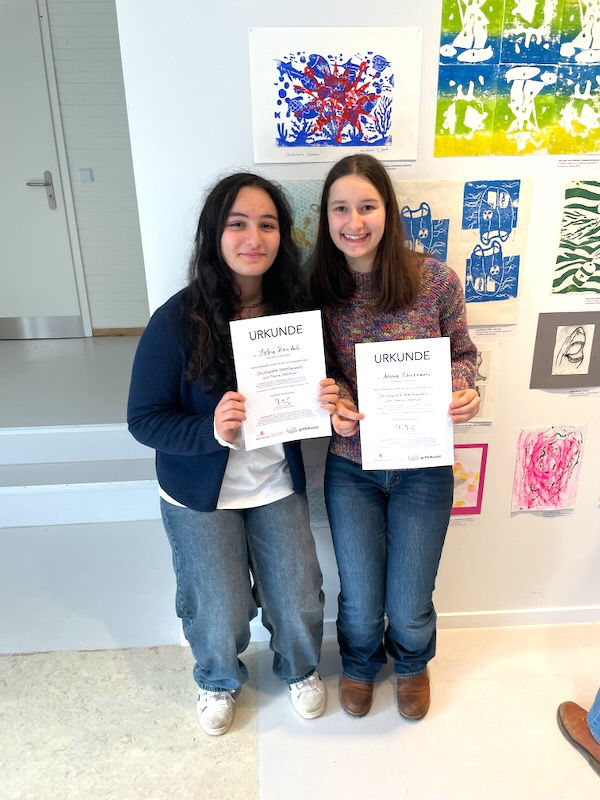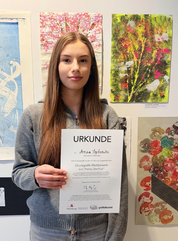 Beim Druckwettbewerb „Überfluss“ konnten unsere Schüler*innen aus dem WF 8 und WF 10 Kunst überzeugen. Es wurden insgesamt unglaubliche 526 Druckgrafiken aus 35 verschiedenen Lerngruppen von Klasse 1 bis 13 aus allen Teilen Hamburgs eingereicht. Die fachkundige Jury war begeistert von der Vielfalt der Drucktechniken von Material- über Linoldruck, Radierung bis Lithografie und die verschiedensten Mischtechniken und von der inhaltlichen Tiefe, die sich in vielen Arbeiten zeigte.