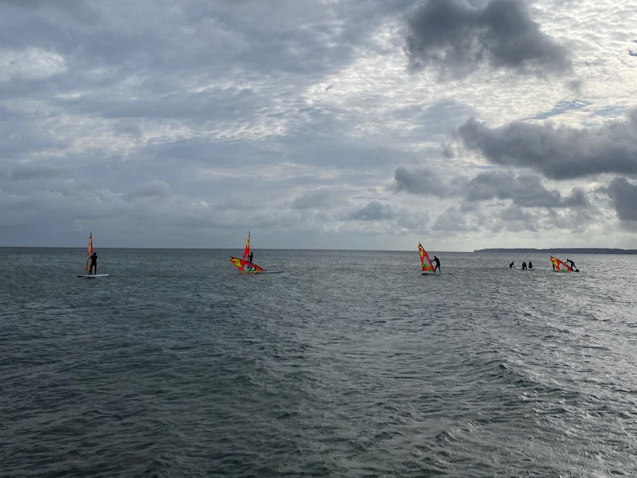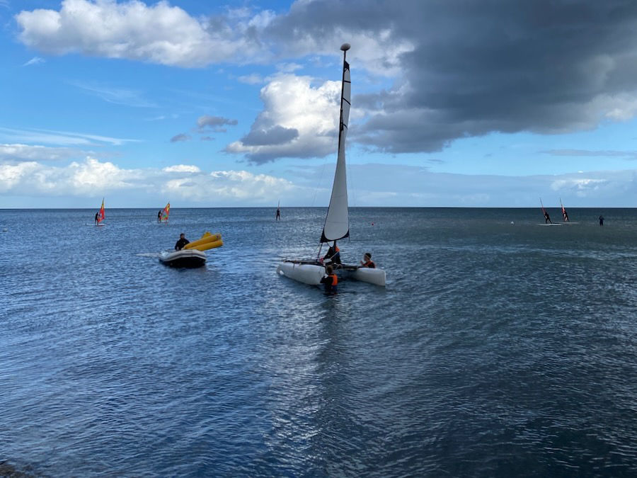 Nun aber genug gewartet, am Mittwoch konnten wir endlich aufs Wasser. Uns lachte die Sonne schon ins Gesicht und voller Vorfreude standen wir schon in den Neos. Leider hielt die Vorfreude aber auch nur so lange, bis wir Bekanntschaft mit dem Gesetz der Schwerkraft gemacht haben, die Katamarane auf einmal falschrum im Wasser lagen und auch die Surfer mehr Zeit im, als auf dem Wasser verbrachten. Aber im Laufe des Tages wurden alle deutlich besser und ob man jetzt kentert, fast von der Strömung abgetrieben wird oder ins Wasser fällt, solange am Ende alle wieder da sind und ein Lächeln im Gesicht haben, zählt es als Erfolg. Und um diesen zu feiern, wurden am Abend die Köche in der örtlichen Pizzeria ordentlich gefordert, bevor sich wieder alle für Poker und Werwolf versammelt haben.